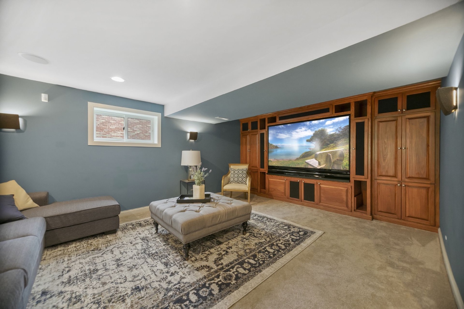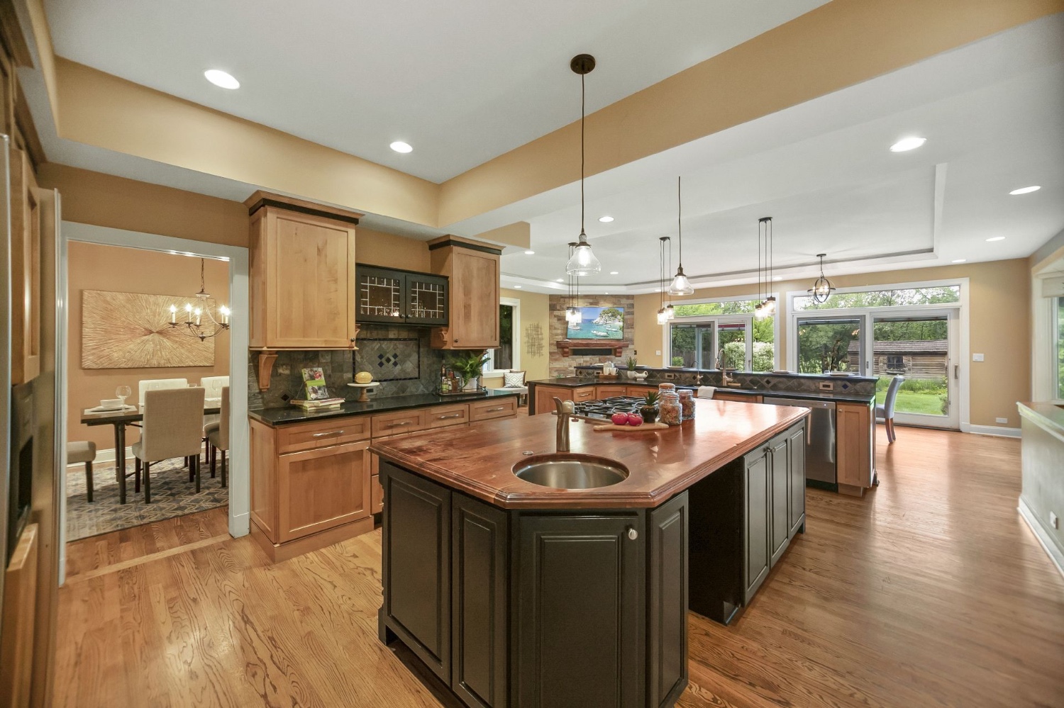 The first floor is drenched in light and features an entry hall that opens to the living room, a dining room and a large kitchen/ family room with a fireplace, as well as a wall of sliding glass doors that open to a spacious paver-brick patio facing the park. Wide oak stairs bring you down to a recreation room which has a wet-bar and a three-sided fireplace, and that opens to the second paver brick patio in the back of the home. The recreation room is combined with a spacious media room with a 82-inch TV and custom built-ins.