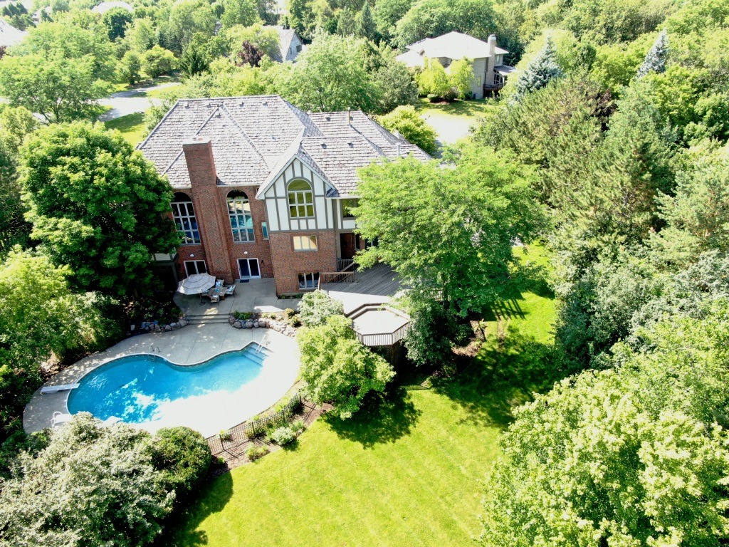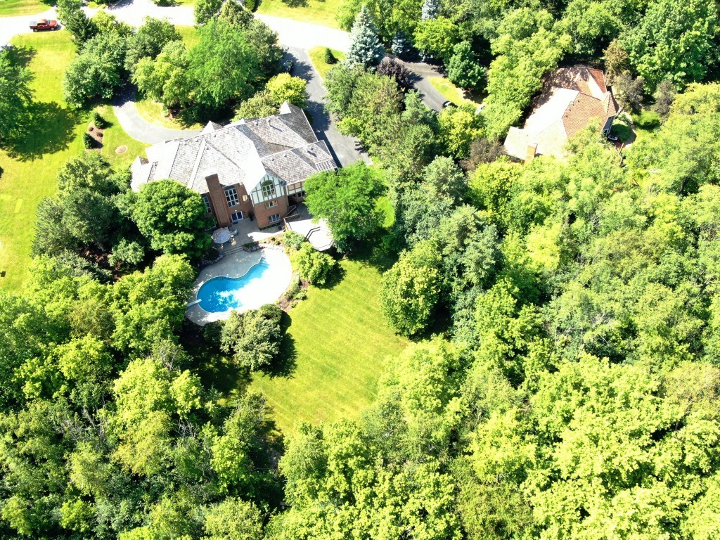 Aerial rear view of home with pool